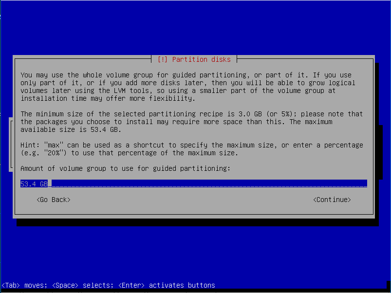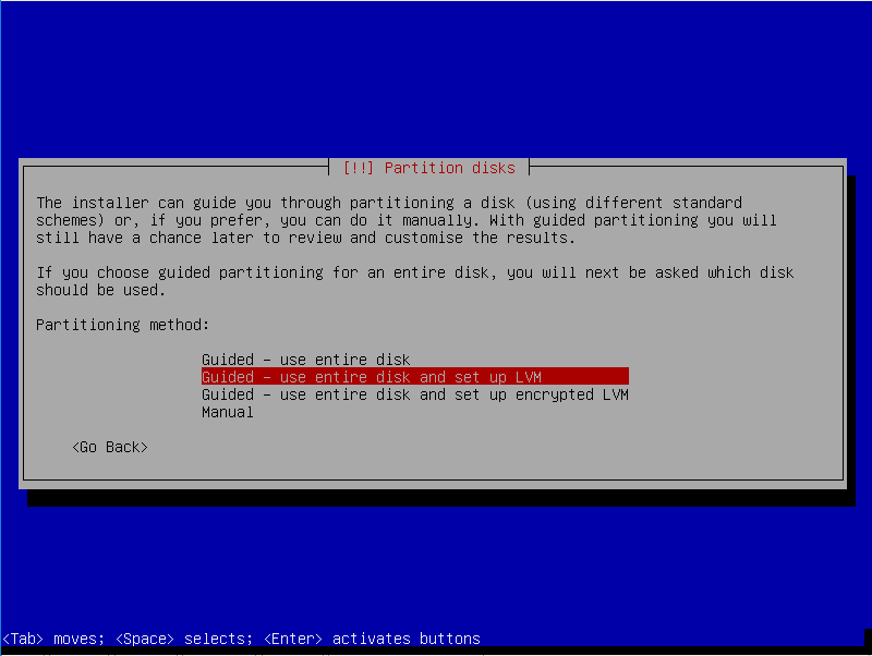 Ardından disk seçimi ve alan ayarlamalarına sıra geliyor. Biz burada LVM uyguluyoruz ilerleyen zamanda diskleri genişletmemiz gerekirse bize kolaylık sağlayacak.