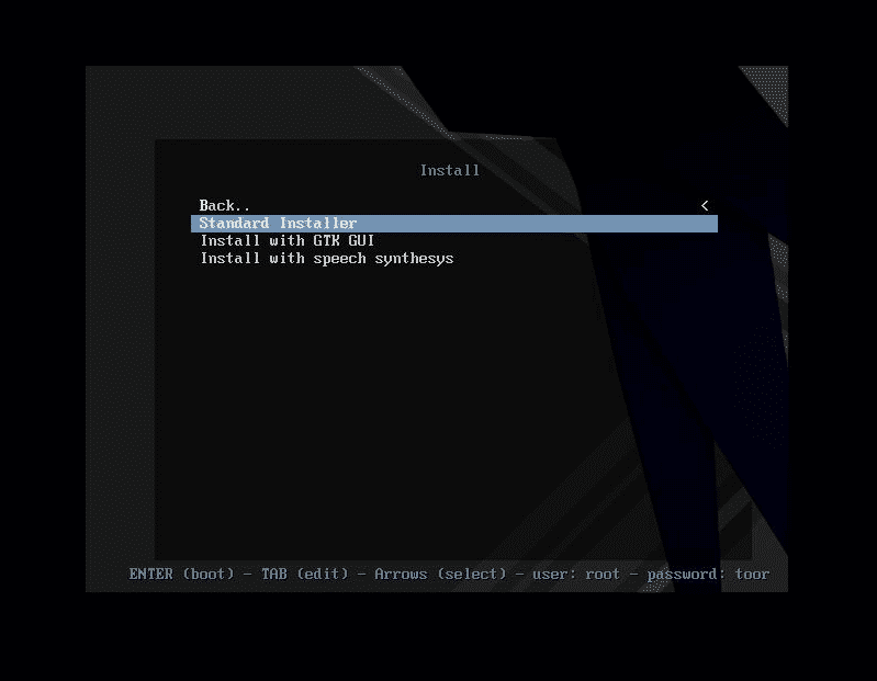 ISO'yu boot ettiğimizde karşımıza kurulum ekranı çıkacak ilk ekrandan "Install" seçeneğini seçiyoruz.
