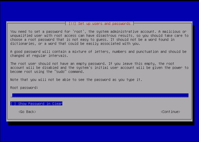 Burada root kullanıcı parolasını ayarlayın ve ardından Continue'ye tıklayın. Kurulum bittikten sonra Parrot Security'e bu parola aracılığı ile giriş yapacaksınız.