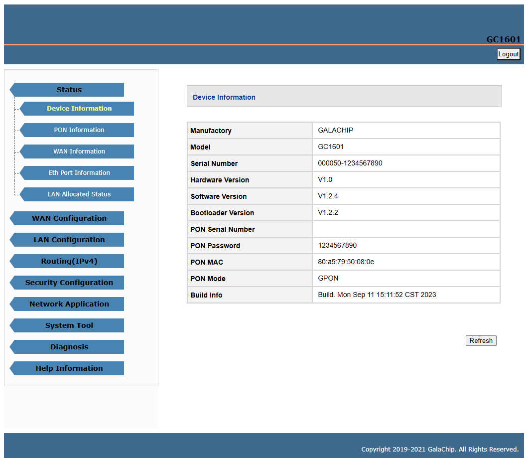 Giriş yaptığımızda aşağıdaki gibi bir ekran karşılıyor bizi genel bilgiler ve PON SN bulunuyor. Genelde gördüğünüz gibi boş oluyor. bunu sizin doldurmanız lazım, arayüzde yoksa SSH/TELNET üzerinden aksiyon alın.